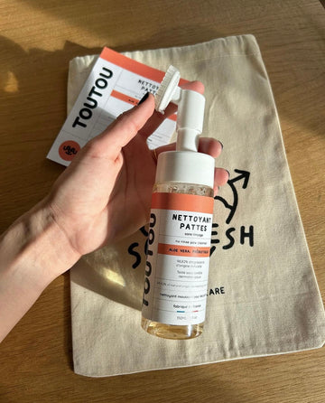 Une formule toute douce à 98,82 % d'origine naturelle, dans un packaging innovant et écoresponsable qui révolutionnera vos retours de balade. L'alternative pratique et écologique aux lingettes.